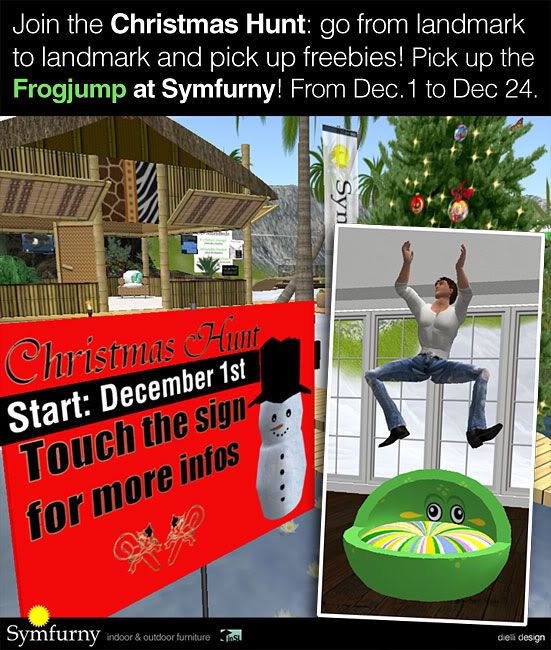 Join the Christmas Hunt 2008! Travel from landmark to landmark and pick up lots of freebies. Many shops in SL participate, so there will always be a freebie you like. For example: jump like a frog with the free Frogjump at Symfurny Furniture. Just 2 prims of fun! You just have to find the little sculpty snowman in the participating sims.