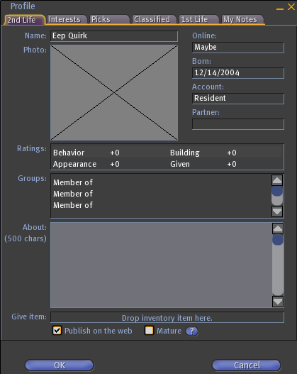 Added "1st Life" tab, tweaked some of the others to be consistent overall (borders mainly), and made tab images show with onmouseover Javascript vs. onclick. This is the first time I've used an HTML image map too (in only 9 years of HTMLing!).