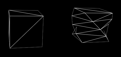 From: Sable Sunset I may be looking at this the wrong way - but surely a cube that has been cut, twisted and advanced cut has the same 'tri-count' as one that is default? The fact that the values are set to 0 shouldn't change the fact that the polygons that make up a cube (with allowances for being cut, twisted etc.) still have to be rendered. There should be no difference in rendering times between a default cube and one that has been tortured, should there? There should, however, be marked differences in polygon count (and therefore render time) between the prim types. At least, that's what I would have thought... The number of triangles for any shape tries to be as few as possible for that shape, so a cube that hasn't been modified is only 12 triangles, whereas one that's been modified will be more. Do demonstrate, here's a picture of the (camera facing) triangles used for a basic cube and one that's been twisted 90 degrees:  EDIT: Why won't the forum show that as an image rather than a link?!?