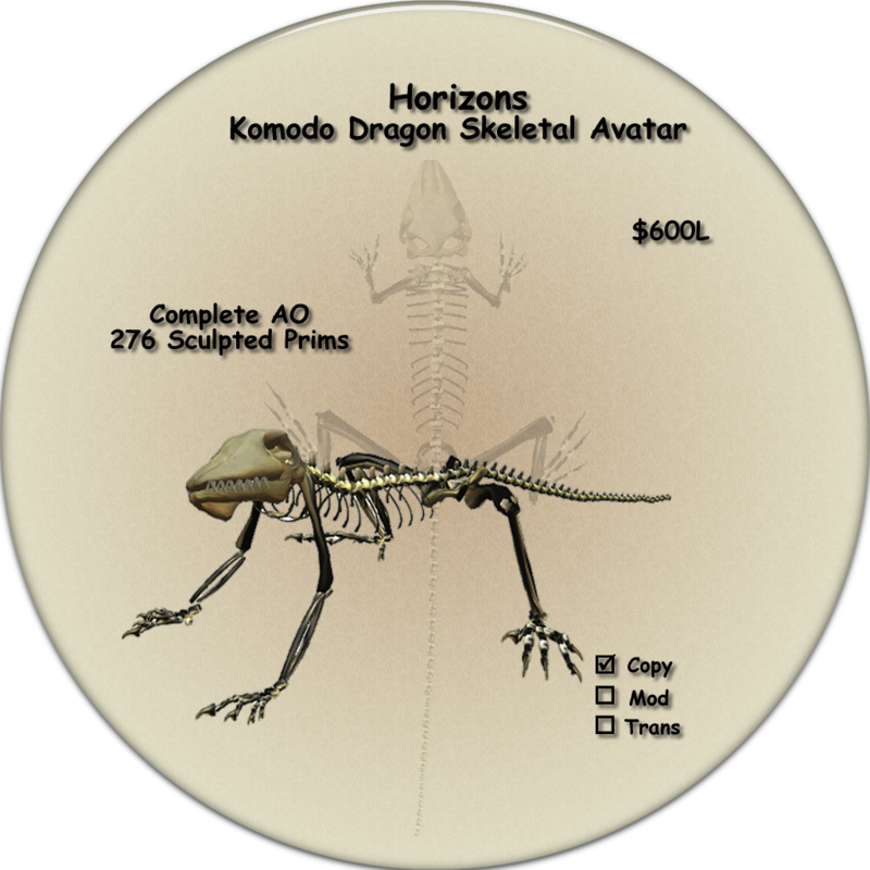 This Skeletal Avatar is sculpted of over 276 prims and comes complete with Shape and AO. It measures 3 meters in length and just over half meter in height. It is modeled after the Komodo Dragon the worlds largest living Lizard species.