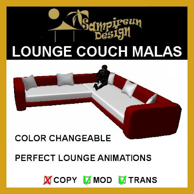 Our latest release is a Lounge Couch, complete with great lounge animations in the pillows, and as you are used from us, color changeable.