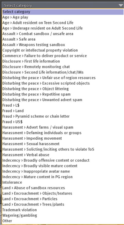 I just saw these. What do folks think of them? From: someone Age > Age play Age > Adult resident on Teen Second Life Age > Underage resident on Adult Second Life Assault > Combat sandbox / unsafe area Assault > Safe area Assault > Weapons testing sandbox Copyright or intellectual property violation Commerce > Failure to deliver product or service Disclosure > First life information Disclosure > Remotely monitoring chat Disclosure > Second Life information/chat/IMs Disturbing the peace > Unfair use of region resources Disturbing the peace > Excessive scripted objects Disturbing the peace > Object littering Disturbing the peace > Repetitive spam Disturbing the peace > Unwanted advert spam Fraud > L$ Fraud > Land Fraud > Pyramid scheme or chain letter Fraud > US$ Harassment > Advert farms / visual spam Harassment > Defaming individuals or groups Harassment > Impeding movement Harassment > Sexual harassment Harassment > Soliciting/inciting others to violate ToS Harassment > Verbal abuse Indecency > Broadly offensive content or conduct Indecency > Broadly visible mature content Indecency > Inappropriate avatar name Indecency > Mature content in PG region Intolerance Land > Abuse of sandbox resources Land > Encroachment > Object/textures Land > Encroachment > Particles Land > Encroachment > Trees/plants Trademark violation Wagering/gambling Other