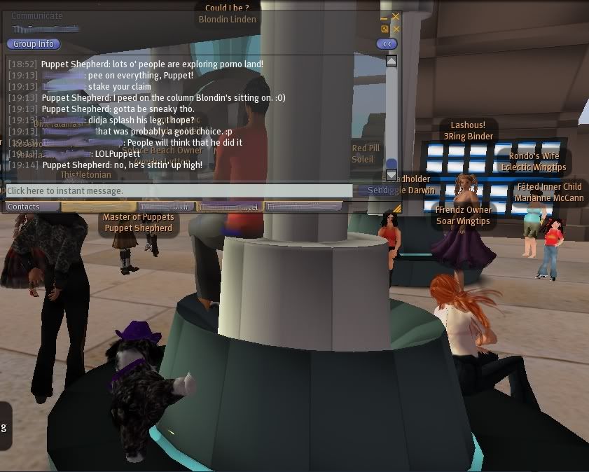 From: Puppet Shepherd My very most favorite thing about the new continent of Zindra is that I got to explore it on the first day it was open and stake my claim on it! It was fun getting to see a bunch of fellow Forum-ites there, and I even got to meet Geo Linden, the ninja dog! I also appreciated the greenery for my own special doggie reasons.  Please note that no Lindens were harmed in the making of this picture, and that I only do what comes naturally to my species when exploring a new place! Names in group chat are blurred out to protect the, um, innocent? Off to work I go now (early meeting), to work like a dog! LOL, remind me never to sit there.
