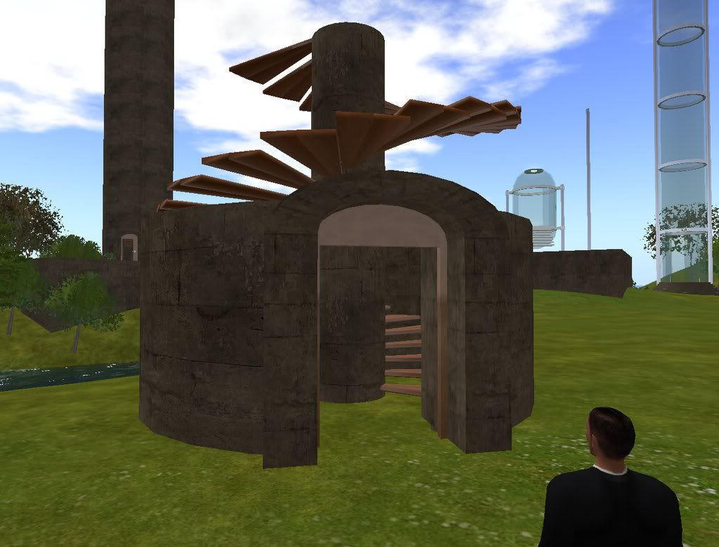Thanks for sending me the sculpties Drongle..nice stairs they look great. I tried the same texture as used in the Tower and put a central column and outer wall in and the result was pretty much identical (see pic below) The down-side to sculpties is as you say in the card, they have to be phantom and supported with a ramp. However when the savings are 4000+ prims in a build this size..it's got to be worth considering. I may well use this in my next 'little' project Thanks again..Perre..