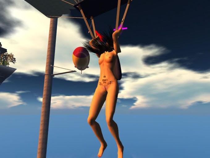From: Sassy Romano ...We failed at the tightrope walking but made up for it by naked sky diving  Then we went dancing bottomless wearing the t shirts. Newbie has new perspective on fun. .... Naked skydiving? Talk about falling free... But...doesn't a parachute count as "attire"? So you weren't ALL naked, were you now, Missy? Or did you leave the chutes at the top and just trust to SL physics to save your bare asses? Which brings to mind a fun game. Launch high, sans parachute. On the way down, open inventory, rummage about, find chute, wear chute, find directions, read directions... If you manage to open your chute before you bounce -- YOU WIN! After you get good at this, work on starting the jump wearing, say, a Victorian dress with prim lace cuffs and petticoats...and ending up at the bottom wearing a jumpsuit and helmet, all properly attired and skydiverly.