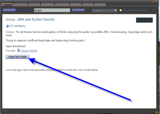 From: Shelley Galicia I found that this starts occuring after having run two simultaneous logins at some point. . This makes sense, and results from the fact that there is only one broswer cache for the embedded browser, shared by both accounts when two or more accounts are used on the same machine, whether at the same time or one after the other. Those showcase are web pages displayed by the embedded Mozilla browser. People whose computers behave in bizarre manners, showing things in the wrong colors, not displaying screens referred to in instructions, etc. could greatly ease the burden of trying to help them by providing screen shots of what is one their screen and explaining what happens on their end of things in enough detail to convey that their question stems not from unfamiliarity with a change in the system's design but from the fact their computer system is all screwed up in a way no one could possibly be expected to figure out or expect without being told. That was a fair amount of time to invest in downloading and installing the regulation LL client, making screenshots, resizing them to fit in the forum's display, uploading them to my photobucket account, and writing the accompanying text, for not much purpose, apparently.
