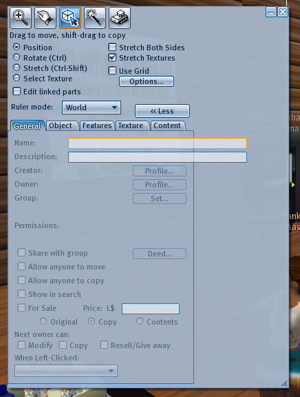 From: SuezanneC Baskerville I think the file you mentioned is the dialog box that appears when you right click an object in inventory and select Properties. That dialog is titled Inventory Item Properties. If you mean the one with the General, Object, Features, Texture, and Content tabs, then I think you want floater_tools.xml. There's a value name can_resize in floater_tools.xml . Change the value from false to true and you will be able to make the Tools dialog wider. You can do Advanced, XUI, Edit UI, and you a box that lets you edit particular parts of the interface. Click in the fields that display Object Name and Object Description, and you can use the Edit User Interface dialog box to make those fields wider. You can do Advanced, XUI, Show XUI Names and you will get an annoying but informative popup with info on what files interface elements come from or then name of the name of the particular element your cursor is on. The file floater_tools.xml has a section with: My example shows a width of 260 because I widened the fields, I think they were 127 to start with. Here's my extra wide tools dialog (what I call the edit box at times) with extra wide object name and description fields: Good Luck, I'm sure I'll end up reinstalling the program now. Worked great, thanks!