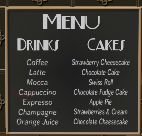 There's a coffee shop or some such in Bay City by the name of Cafe Deco. It's owned by Governor Linden. Nice looking place, but.... There's a menu on the wall like this:  The only thing they carry there is the house coffee. There's no cheesecake, no latte, nothing but house coffee. One expects Governors to lie, cheat, steal, and worse in their duties as Governor, but when it comes to doing something important like running a coffee shop they should be held to some kind of standard of honesty and decency. Tantalizing people with offers of Mocca and Chocolate Fudge Cake and then not delivering is just plain cruel. Shame on you Governor Linden.