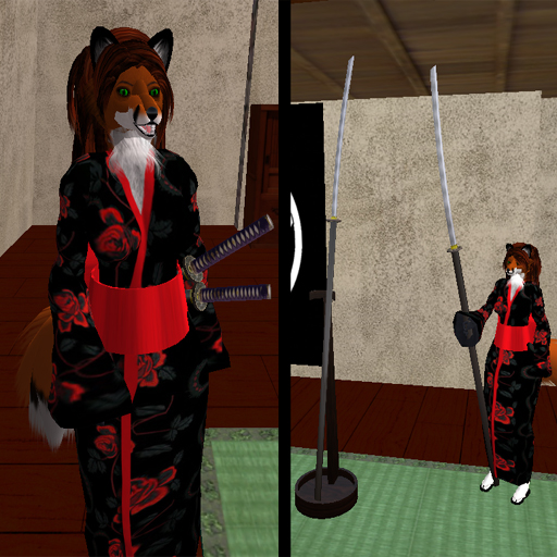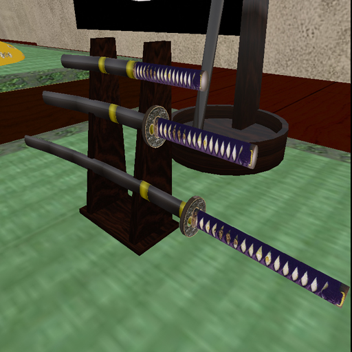 Well, I don't do combat, so for mine all I wanted was a beautiful appearance and the ability to draw and resheath them. I made my own set, with a Katana, Wakizashi, Tanto knife, and Naginata, all with the wavy patterns on the blade caused by the traditional folded-steel making technique, and with tsubas (hand guard disc) that have roses on the piercework disc (based on an actual antique set in a museum). On the Katana, Wakizashi and Tanto, the grips on my set are wrapped in purple cord, with white sharkskin below that, and you can see the two charms under the wrappings, and the wooden peg that holds the blade in place. The sheaths and the pole of the Naginata are all in black lacquer, and there's a floor stand for the Naginata, and a rack for the other three blades. I also made sets with black, blue or red handle wrappings, for friends. But again, mine do NOTHING for combat. All you can do with mine is wear them and draw the blades. Will make a few pics, if anyone is interested. I'd be interested in seeing them, myself. I don't use my combat, they're just an accoutrement appropriate to my avatar. ![]() |