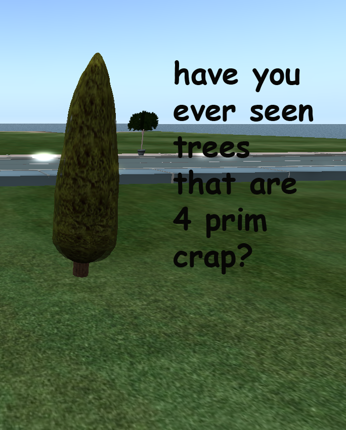 In fact, even my prim trees look worse these days. I've been seeing all sorts of prim plants lately, mine and other people's, that are supposed to be completely transparent on the edges but instead stay permanently gray so that the prim borders are plainly visible. It doesn't seem to be a rezzing lag issue, because everything else rezzes fine around them, it's just the alpha texture isn't rezzing. *is clueless* Help?