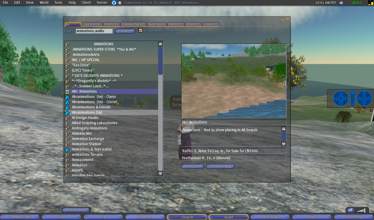 From: Tyche Shepherd The "ALL" search is just ordered Alphabetically, traffic or plot size are not factors in the search - All includes Classifieds & Groups etc as well as places so it's not relevant to sort by those criteria. Land Places does sort by traffic as a default You are completly wrong ! Traffic is more important that alphabetic order ! if you don't have traffic probally U will not appear in the "All page"...the search at All page is sorted by Alphabetical order and traffic.Dunno if there is anothers criterias too (maybe). Simple : Ppls spent a lot of money with camping just to increase the traffic to appear on the All Tab results.