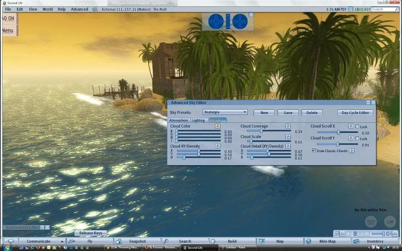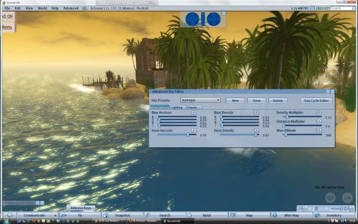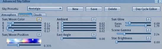 Nostalgia settings for those who can't get it to download: - <llsd> - <map> <key>ambient</key> - <array> <real>0.070000000298023224</real> <real>0.070000000298023224</real> <real>0.070000000298023224</real> <real>0.070000000298023224</real> </array> <key>blue_density</key> - <array> <real>0.059999998658895493</real> <real>0.11585251241922379</real> <real>0.055609758943319321</real> <real>0.17000000178813934</real> </array> <key>blue_horizon</key> - <array> <real>0</real> <real>0.099999994039535522</real> <real>0.08999999612569809</real> <real>0.2199999988079071</real> </array> <key>cloud_color</key> - <array> <real>0</real> <real>0</real> <real>0</real> <real>0</real> </array> <key>cloud_pos_density1</key> - <array> <real>0.5</real> <real>0.5</real> <real>0.17000000178813934</real> <real>1</real> </array> <key>cloud_pos_density2</key> - <array> <real>0.4699999988079071</real> <real>0.5</real> <real>0.125</real> <real>1</real> </array> <key>cloud_scale</key> - <array> <real>0.10999999195337296</real> <real>0</real> <real>0</real> <real>1</real> </array> <key>cloud_scroll_rate</key> - <array> <real>10.49940013885498</real> <real>10.01099967956543</real> </array> <key>cloud_shadow</key> - <array> <real>0.32999998331069946</real> <real>0</real> <real>0</real> <real>1</real> </array> <key>density_multiplier</key> - <array> <real>0.00011000000085914508</real> <real>0</real> <real>0</real> <real>1</real> </array> <key>distance_multiplier</key> - <array> <real>3.4000000953674316</real> <real>0</real> <real>0</real> <real>1</real> </array> <key>east_angle</key> <real>0</real> <key>enable_cloud_scroll</key> - <array> <boolean>1</boolean> <boolean>1</boolean> </array> <key>gamma</key> - <array> <real>2.2400000095367432</real> <real>0</real> <real>0</real> <real>1</real> </array> <key>glow</key> - <array> <real>4.2061538696289062</real> <real>0.0010000000474974513</real> <real>-0.44246155023574829</real> <real>1</real> </array> <key>haze_density</key> - <array> <real>3.6699998378753662</real> <real>0</real> <real>0</real> <real>1</real> </array> <key>haze_horizon</key> - <array> <real>0.77999997138977051</real> <real>0.19915600121021271</real> <real>0.19915600121021271</real> <real>1</real> </array> <key>lightnorm</key> - <array> <real>0</real> <real>0.86074197292327881</real> <real>-0.50904154777526855</real> <real>0</real> </array> <key>max_y</key> - <array> <real>368</real> <real>0</real> <real>0</real> <real>1</real> </array> <key>preset_num</key> <integer>10</integer> <key>star_brightness</key> <real>0</real> <key>sun_angle</key> <real>2.1048672199249268</real> <key>sunlight_color</key> - <array> <real>0.50999999046325684</real> <real>0.31450000405311584</real> <real>0.025499995797872543</real> <real>0.17000000178813934</real> </array> </map> </llsd>