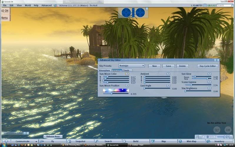 Is there a place for people share their Windlight settings? Or would this be considered something like a shape that's either personal or something to be sold. I'm not entirely happy with the presets and would be interested in seeing what others have come up with. There was a thread where one Windlight setting was posted that tends to be more like the old viewer. I forget how it was done and now I can't seem to find the thread.