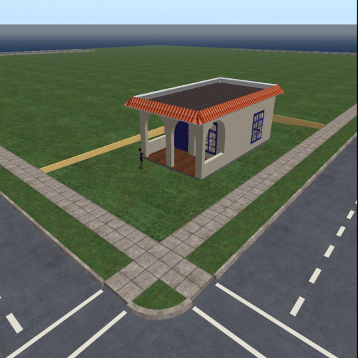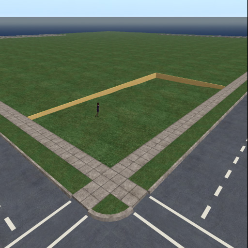 The above pic shows a 512 M2 parcel, from the inside edges of the sidewalks, to the plywood fences. The sidewalks are outside the parcel edges, and are 2M wide, with 1M squares on the pavement. That's me in the lot, and my avatar is 5'7" tall (small by SL standards) as measured with an avatar ruler. And I'm wearing high heels. This pic shows the same lot with a 1-room bungalo dropped on it. That is a 10 M wide by 20 M long building, counting the front patio, and has barely enough room inside for a 150 M2 floorspace studio apartment with a queen size bed, a couch, and a kitchenette with a counter to eat at. That small building is 57 prims, so you'd have only 50 prims free for furnishings, fence, and plants. FYI - The pics were taken in the RUCE 4 sim, which I am building for Rutgers University. So far, it just has the streets and sidewalks around the edges, built at 1.5x scale, which works extremely well with most typical SL cars and avatars. The sim will eventually house school buildings for in-world classes, and a student store and recreation center for their students and faculty. It's one of 4 sims I am building for them. _____________________