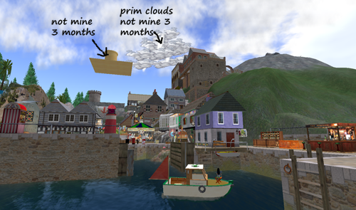 Floating a little higher is a rickety looking cottage perched on a stone tower. It's a bit small to be practical, but I like the style so much I don't want to de-rezz it. At ground level there's been modernist glass & concrete houses, landscaped gardens, abandoned factories and a skate-park. My imagination often overreaches my prim limit. It's so long since I've been down there I'm not sure if there's anything now... maybe a copy of the cottage.