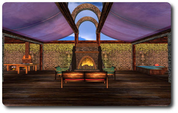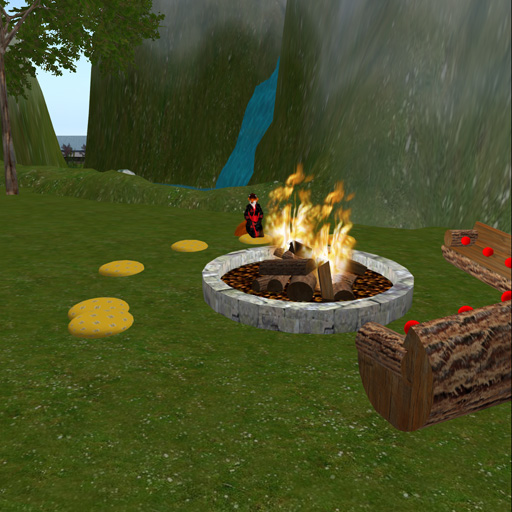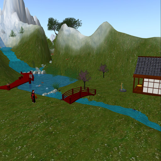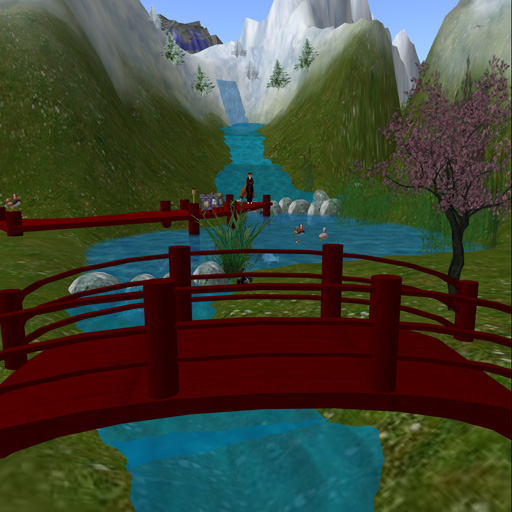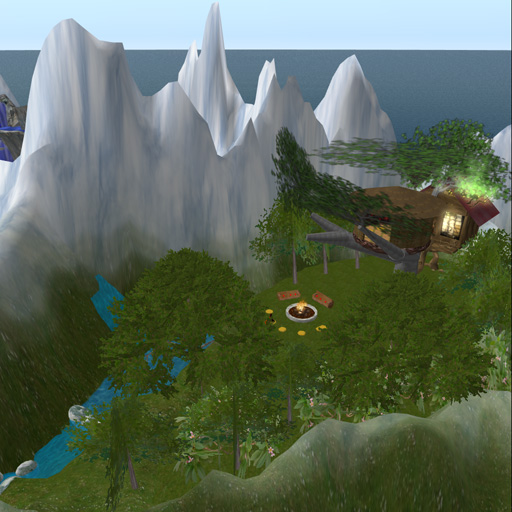 Koi pond and bridge  Sauk Valley - A secluded area for some of my friends.  Bonfire ring in Sauk Valley. Not shown: 4 small skyboxes (mostly for friends to use when they want some privacy), and a skybox lounge with an avatar prep area, photo studio, and a shared social space with a dance ball. (My non-period "family room"  .