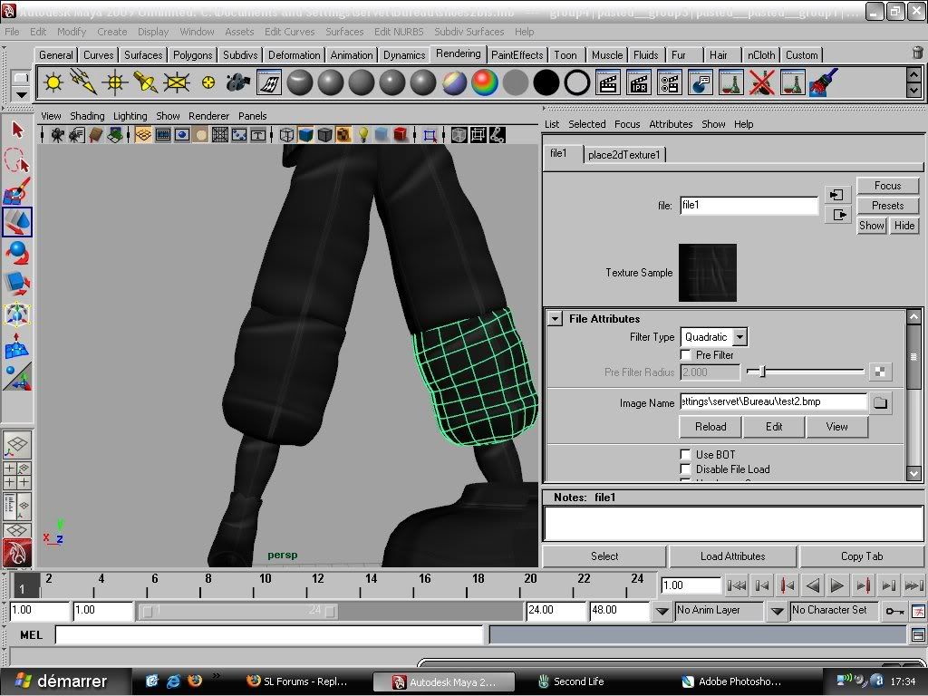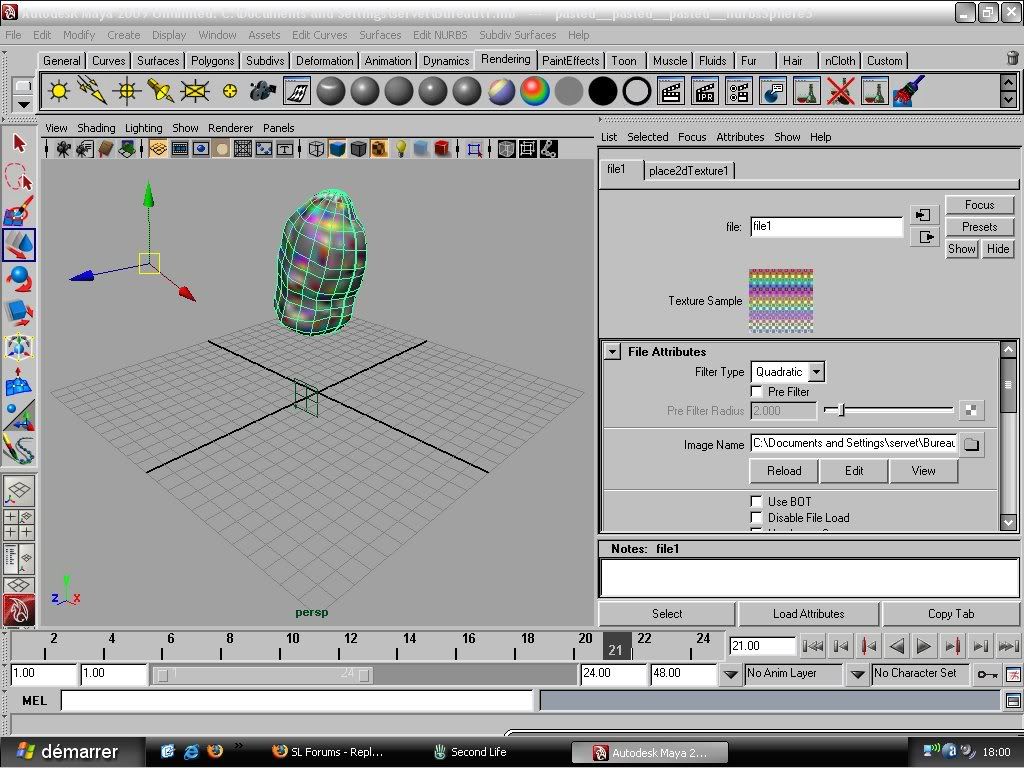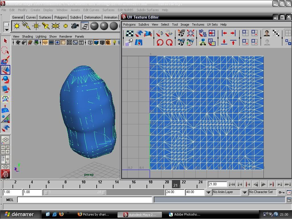 1. Create your source model using NURBS, from start to finish. 2. If you want to be able to do texture paining in PS, Convert the NURBS model to polygons, with the type set to Quads, and the tessellation method to Standard Fit (you can use other methods, but Standard Fit will be easiest). Do not delete the original NURBS model. The poly version will be a copy, just so you've got something for PS to work with, not a replacement. Export the poly version of the model to OBJ, texture it in Photoshop, and then apply the texture to the NURBS model in Maya. Note, you may need to do some cleanup work on the 2D canvas in PS, along the top and bottom rows of faces, as those areas will be saw-toothed, if your source model was spherical. If you want to avoid that, start from a NURBS cylinder instead of a sphere. 3. If desired, do any additional baking in Maya, to finish the texture. 4. Export a sculpt map from the NURBS model, upload the sculpt map and the diffuse map (texture) to SL, and apply to a sculpty. Hello thanks Chosen for those step ![]() i have photoshop cs2 but i can't open .OBJ file ,so is there a way to unfold a poly/nurbs for have the form for the texture? |