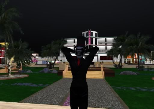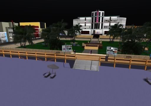 Now the problems are more obvious. We have some Linden Land in the shot, in the same sim, which can't be made fullbright, and the contrast is more obvious. The beach is relatively dark, while the boardwalk, ground, and buildings behind remain explicitly bright. The plants are properly darkened, but this just adds to the confusion in my mind, personally. It just doesn't make sense.