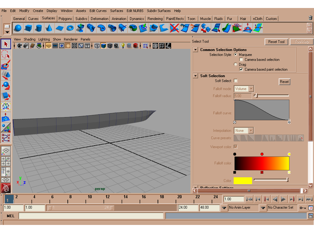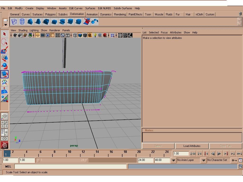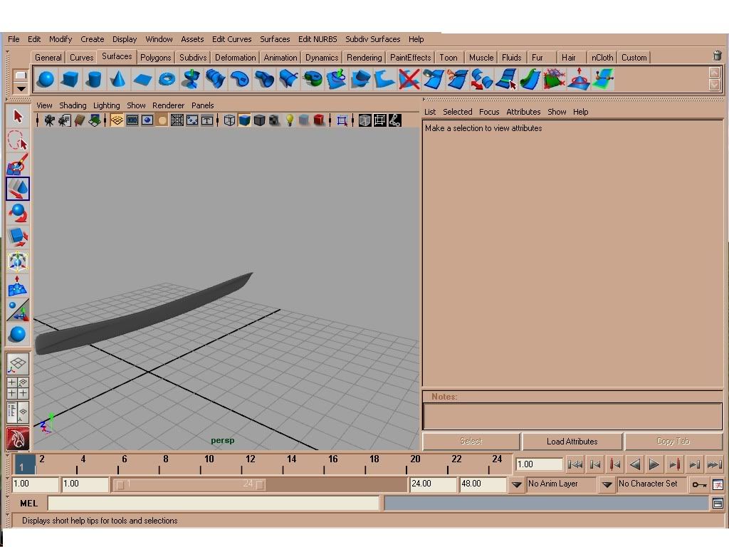 From: yondaime Larsson i tryed to make a blade with a nurbs sphere 16 sections and 7 spans .i deformed it by scaling and moving the vertex points but it looks take much time .maybe there is a trick for make it easy i don't know. There are definitely some tricks that can speed things up for you. Deformers, for example are very powerful, and very fast. You'll find them in the animation section of Maya, since that's what they're most often used for, but they're also fantastic modeling tools. Really, though, it just comes down to getting used to the medium. Modeling for sculpties is pretty different from modeling for any other purpose. Little changes in your thinking about things like order of operations can make huge differences in the amount of time things take you. From: yondaime Larsson then when i upload (i cleared history and freeze & reset transformations) it was worst :(. Yikes, not sure what happened there. As long as you didn't break your source geometry, you deleted history, froze & reset all transformations, and uploaded your sculpt map losslessly, it should have worked. I'm not sure what you did wrong, sorry. If it helps, here's how I'd do it. This took me about 25 minutes, from start to finish, just now:    And here it is in SL:  If I were making this for a real project, I'd give it a lot more detail in the texturing, and I'd model more carefully to avoid any 8-bit rounding errors. But hopefully there's enough there for you to get the idea. From: yondaime Larsson with cylinder i don't know make sculpt .i only use nurbs sphere curves and loft. i tryed use cylinder for a pant a while ago but in uplaod it was deformed . i'm confused with the top and down of nurbs cylinder. If I'm reading you right, you were confused by the fact that the top and bottom of the cylinder were open. Is that correct? If you want to close the top and bottom, simply snap those hulls to single points. From: yondaime Larsson Is there a limit for numbers of spans and sections? Technically, no, there's no limit on what your source model can have. But for best results, stick with the following numbers. Use 16 sections and 16 spans for standard sculpties, and for oblongs, use 32x8 or 64x4. Remember, inside SL, your sculpties willl be made from 2048 polygons. The standard configuration is 32x32 quads. Oblong configurations can be 64x16 and 128x8*. For the most consistent match between your NURBS source model and the in-world poly model, half the number of sections and spans as the number of polygons tends to work best. *Note, 128x8 might actually have been changed to 128x6. I haven't looked at it in a while. LL had talked about making that change in order to cut down on render lag. I'm not sure if they did it or not. I don't often use that particular ratio. But whether it was or wasn't changed, the NURBS source should still be 64x4. Also, remember to keep your map image size as small as possible, so that you can upload it losslessly. Use 64x64 for standard, and 128x32 or 256x16. for oblongs. From: Gaia Clary The main problem with such a shape is that sculpted prims have notorious problems when one axis gets significant longer than the others. The effect is, that the edges get very jaggy, if you do not take care about the vertex resolution, which is 1/256 along each axis. So you need to shift your edge vertices to positions on the 256*256*256 grid spanned along the bounding box of your object.
