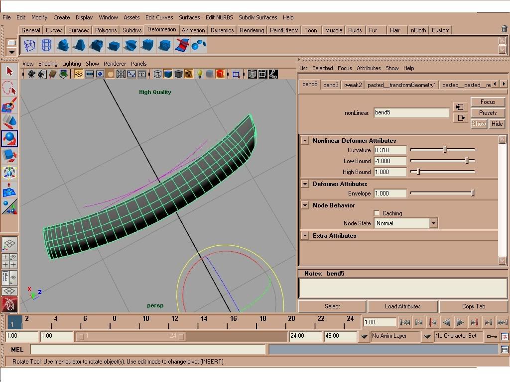 hello  ,i tryed to follow Chosen's sword tutorial and i learnd a lot  . so it was a 16 section and 16 spans sphere that i transformed to a cylinder with a rebuilt surface with spans U=32 and spans V=8 . i saved the texture in 32*128 as you did . i made one with bend deformer and an other without bend deformer: without bend deformer (just litle moved vertexs for bend): i think my blade 's point need to be better and the blade's up is too round on up side i did pics of my blade and a one of a good blade i bought . (the textured one is the one i bought) on maya:  on secondlife:    i got problems with the bend deformer ,the blade looks have more bad relief as the this pic: on maya:  on secondlife