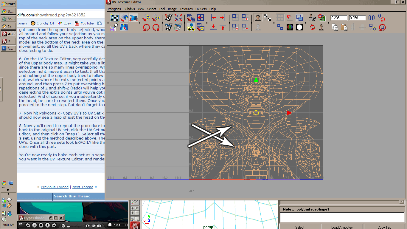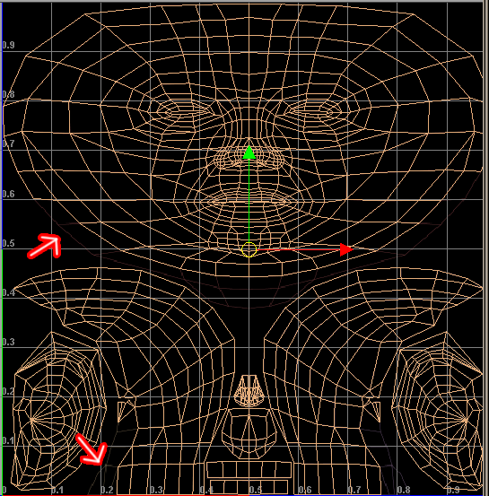 6. On the UV Texture Editor, very carefully dese|ect all the points that are part of the upper body map. It might take you a little while to figure out what's what, since there are so many lines overlapping. When you think you've got the se|ection right, move it again to test. If all that gets moved is the head map, and nothing of the upper body tries to follow you, you're done with this step. If not, watch where the extra se|ected points are as you move the se|ection around, and then press Z to put everything back where it came from. A few repetitions of Z and shift-Z (redo) will help you pinpoint the trouble spots. Keep dese|ecting the extra points until you've got nothing but the head map se|ected. And of course, if you inadvertently dese|ect any of the UV points from the head, be sure to rese|ect them. Once you've got the se|ection right, proceed to the next step. But don't forget to undo any movement.