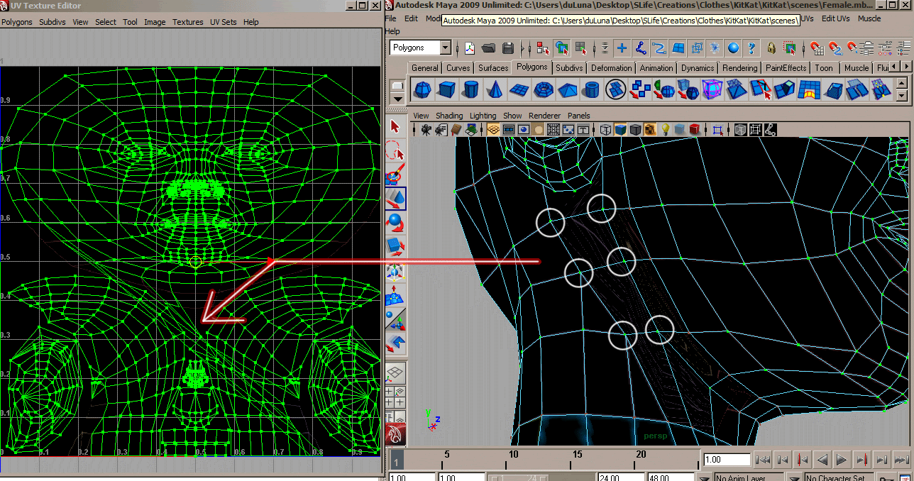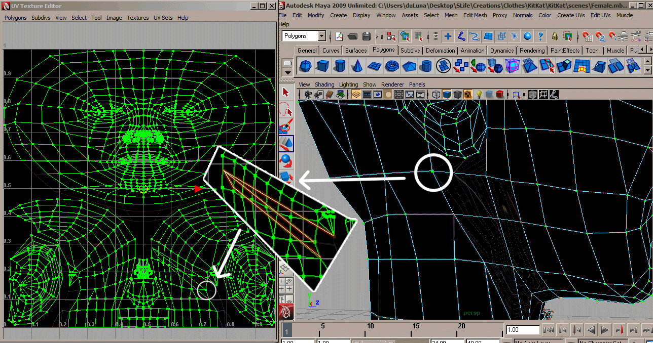 asghaksfgj auuughhh you rock <3 thanks again for all your help! Sorry for the late response, I forgot to subscribe and didn't see a reply <333 ff thankyouthankyou I know what to do now, was a little confusing differentiating it (still thinking highly 2-D here), but I got it down pat, I think. I noticed the only obscure vertices were at the top of the head in the UV Editor coordinate map thing, so I slapped on the UV image defining were all the lines were, making it easier to cut. Alas, all the lines were as you said, right around the ring where the body meets the neck in the texture. However, I noticed that when I pulled the Head UVs away from the original upper-right block, there were still things attached. Do all lines attached mean it's hooked to the body? I noticed they were coming from the mouth area... so I went ahead and copied into a new UV set anyway and this is what it looks like: http://img.photobucket.com/albums/v38/neko-vamp/crisscross.gifis that right? @_@ should it criss cross?