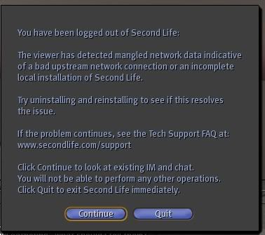 Hmm, it just logged me out as a result of mangled network data.  I was using the latest version of the god mode program, which sits in between the client and the SL servers, that might account for the mangled network data. But the unresponsiveness problem was happening before I installed the godmode program.