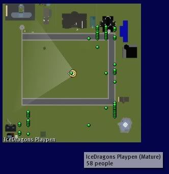 ![]() I am not bashing you in any way, you have 23 people on the sim active and participating and that is great. All I am pointing out is that more people are their zombied out than are ones who are alive and well. If you go back and read my first post I was actually saying it was a feat to see 100 avies in the sim without much lag. You cannot however say you would have reached this accomplishment without the help of your camp chairs and dance pads. The BlockParty area is the area you have circled as the dance pads area on your previous post if you actually took a sec to look not just count numbers, you would see the colored blocks with the colored pads that all the regulars know as the blockparty area. Sorry your not here when we at Icedragon's are holding Battle of the sexes Trivia or xmas here the tune and collect the lindens contests and many other contests we hold daily with RockinX radio. The movie playing is Batman Begins. People are saying the movie is great!! People are asking us who don't have quicktime, how to get it and we are instructing them how to do so. Some are off doing laundry or whatever. See those camp chairs we have, they are custom made camp chairs, the best and very comfy. Rick, take a look down the popular places list and read down the list how many of the top 20 are doing camp chairs. If we were to bow down and not do it then yes, we would fall down the list more than likely but, before the camp chairs came on the scene, we did pretty dam good and were in the #1 position before the camp chairs came on. Now, if I decide to drop my camp stuff do you think the rest will?? No!! Plus, right now, with time dilation issues and FPS problems, the only ones surviving this problem that is going on throughout SL is the campers cause they are pretty much just chillin. People like to come to Ice Dragon's and i'm proud of this. When we reached the 100 mark on that one particular day in question it was a good day. We announced all throughout the property that 100 ppl were on the sim and started doing island trivia and contests. I am not in control of where people want to go to hang out in their second Life but i'm glad their picking our place as one of the go to spots. OK, this has got to be the last reply I make regarding this but let me give much shout outs to all that frequent IceDragon's We loves ya, and appreciate every guest that stops in. ![]() |