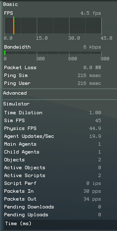 OK. There is a sim near my home that is apparently 'under construction', and is therefore both accessible and empty. These stats were taken in the Paradise sim, with me as the only Avatar in the sim, flying just above a featureless sea.  The 'Sim FPS' stat looks fine - 45 The 'Sim FPS' stat looks fine - 44.9 to 45 Time Dilation? - 1.00 So... WHY does it show a 'Basic FPS' of only 4.5 for me??? I'm the only thing in the sim, right? Shouldn't that top meter read 45? Or at least 19.9. matching the 'Agent updates/Sec' stat? If I go into mouselook and stare at the sea, the fps goes up to 15 or so. Stare at a featureless, cloudless area of sky, and it zooms up to 35 or higher. But if I look at anything? HA! back to the 2 to 5 range. This is very confusing. But I can attest that the lower the reading gets on that top meter, the worse my individual experience of the frame rate and everything else gets.