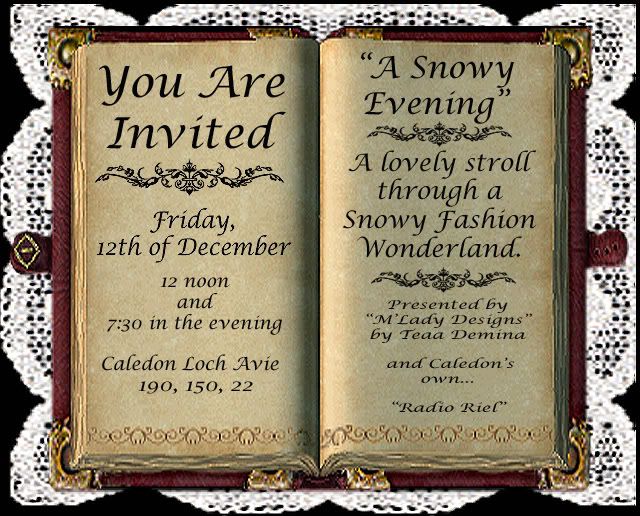 and join us for a spectular evening of holiday slendor at "A Snowy Evening". Stroll though a beautiful snow covered garden of fashions, followed by Dancing and frivolities. Presented by M'Lady Designs and Radio Riel