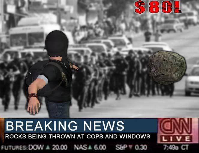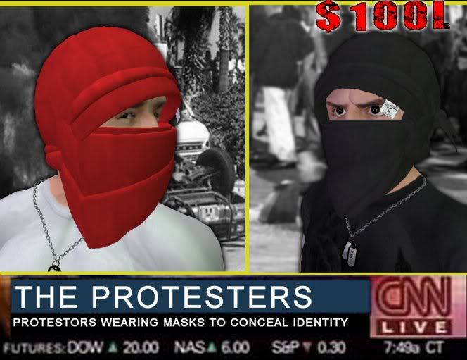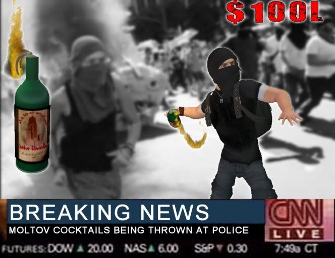 Srsly this has gotten me out of situations with SL police many times, they don't want to arrest you when you throw a molotov cocktail at their face or a rock. Also along with this i made a mask so they can't identify you in teh event that they want to identify you on national tv's to come to your house and kick your dog in the face, then arrest you, that is never pretty.