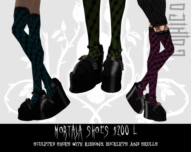 And the Mortaja ones, that have a sculpted ribbon and a little skull, perfect for any goth dress or skirt.