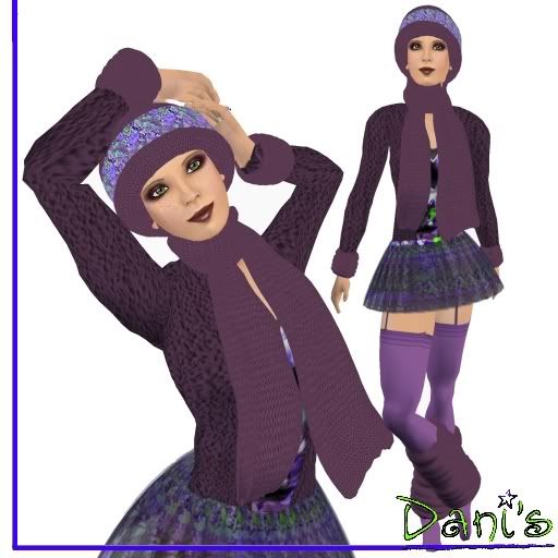 Ice skating in SL is a wonderful activity for friends or lovers. And you'll look your best in this lovely purple skaters outfit from Dani's Fine Fashions. Outfit includes (in scuplty knit) hat, legwarmers, cuffs, and scarf, a nice fuzzy soft knit sweater, bodice, micro-mini flexi skirt, bodice with matching thong and garterstraps. Make figure 8's for infinity and look great the whole time!