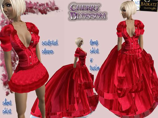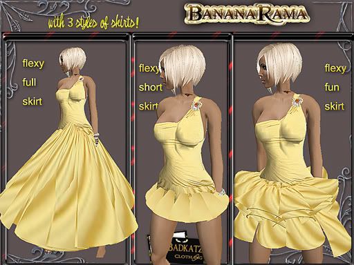 3 New dresses at Badkatz Clothing. Comes with different sizes and styles of skirts. Gold Splash 2 comes with custom sculpted boots with walk sound. See in world at http://slurl.com/secondlife/Radjin%203/197/210/27