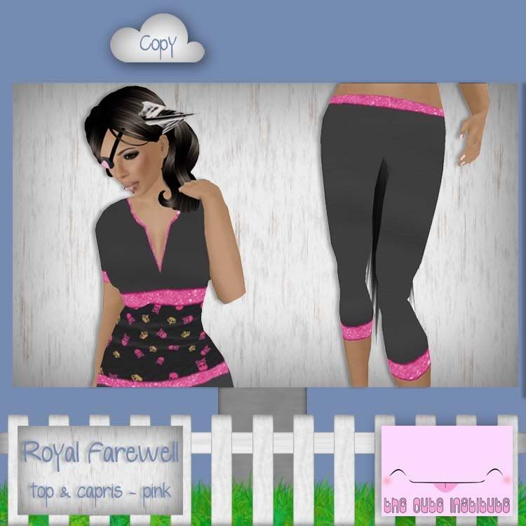 I'll be moving IRL soon but for now, I couldn't resist putting out one last thing before I go. Royal Farewell is available in gold & in pink w/ cute crowns & skulls. Includes a top & capri's in multiple layers (thank Sasy for this  ) Mikayla & I have finally sold the sim. You can now visit The Cute Institute & Crush Factory at Mi Amor Island. All of my products from TCI are there -except- my furniture. I'll work on getting that put up @ OnRez in time. Thanks again everyone for the well wishes & I hope I'll be back designing shortly!