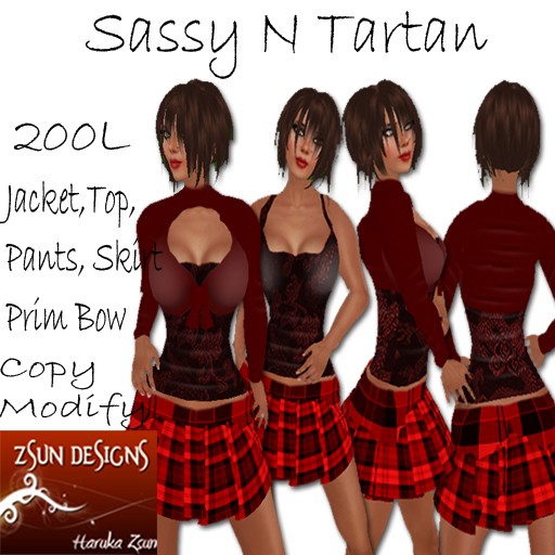 Sassy N Tartan: Cute little outfit consisting of a red cotton jacket, red and black flower patterned silk top and cute tartan short skirt.