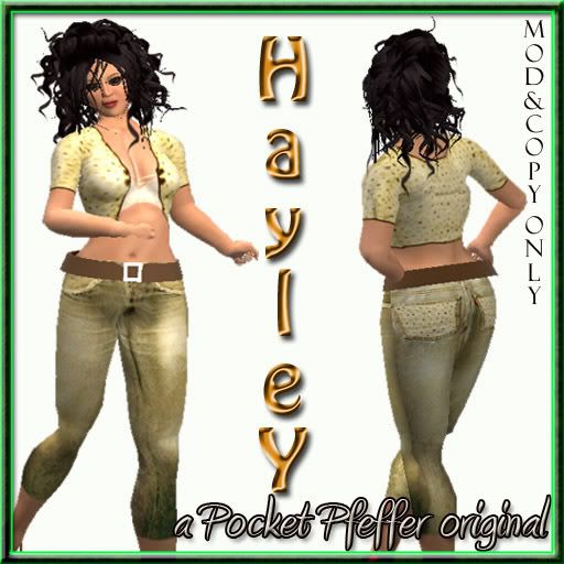 'Hayley' is a casual but chic pants ensemble with matching Jacket, Top, pants and belt.... All mod and copy...... ![]() http://www.slexchange.com/modules.php?name=Marketplace&file=item&ItemID=666331 |
