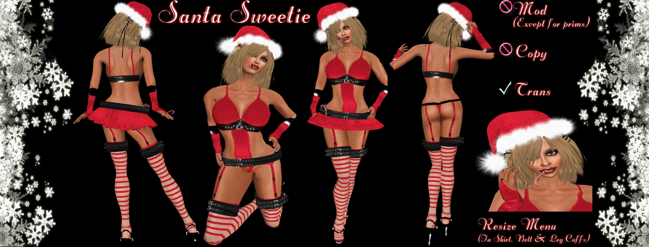*Skirt, Belt and Leg Cuffs have resize menu for easy fitting. Just touch prim to activate.