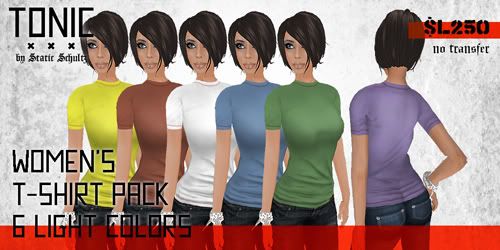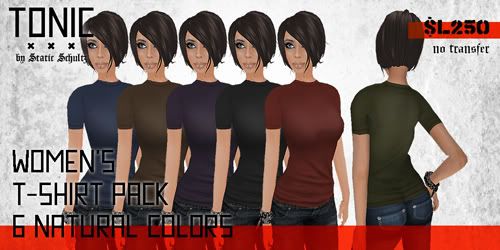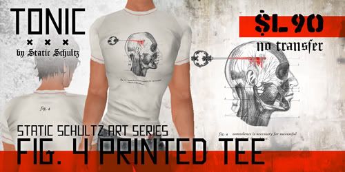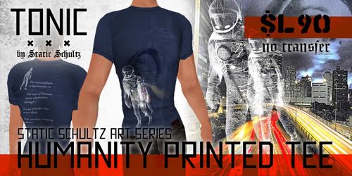 New from TONIC Apparel - Men's printed tees designed in inspiration from my (Static Schultz's) real life digital art works, also being sold in SL. And new packs of women's tees to mirror their men's shirt counterparts.