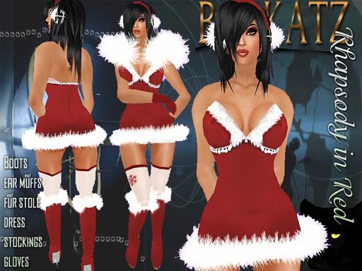 This sexy wintry outfit comes with everything seen here! Prim furry ear muffs, furry stole, fur lined skirt, prim red boots with fur tops, and a body hugging, velvety dress, with gloves and stockings. Everything you need to stay sexy and warm!