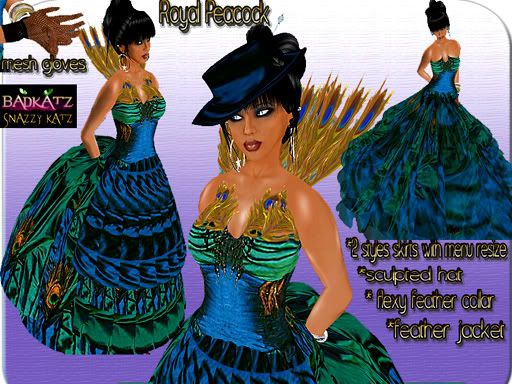 Be the most beautiful bird in SL with this fantastic peacock dress! Brilliant satin corset and 2 styles of skirts, one formal and one vintage layered skirts. Comes with feather jacket and flexy feather collar, hat, and gloves. Fabulous outfit! Only at Badkatz in the SnazzyKatz section. http://slurl.com/secondlife/Radjin%203/197/210/27