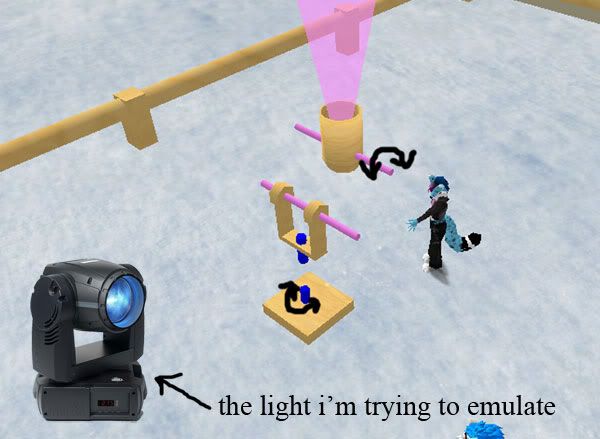 alright, i'm trying to model some intelligent lighting to use in my friends club. the problem im coming across is i would like it to rotate on 2 axis. there is a square base, with an arm that comes off of it that i would like to rotate BACK AND FORTH 180 degrees. that arm has a tube attatched to it that is the "bulb" if you will. i need that to rotate back and forth about 90 degrees. and the kicker, id like to be able to place multiple ones of these and have them all syncronized together. also is there a script i can put to automatically change the colors of light ever few seconds? a picture of what i have can be found here http://img.photobucket.com/albums/v717/BlueChee/light.jpgthanks -Chee
