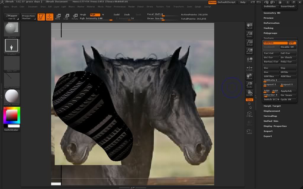 Hiya Virrginia, I suggest you forget your horsey for now and test to see if you can polypaint a basic ZBrush sphere without using ZProject. If so, then test to see if you can polypaint on your horses head without using ZProject or importing a background. Keep adding more steps towards your target process until you find out exactly where it starts to go wrong. It looks to me like your UVs are being destroyed at some stage. The 'Disable UV' button is the usual the culprit behind this. Despite its name it actually destroys the UVs and doesn't just disable them. This means you can't just disable them and re-enable them as one might expect. So never ever hit that damn lying nasty filthy button. I'll report back to see how you get on. Just don't give up!